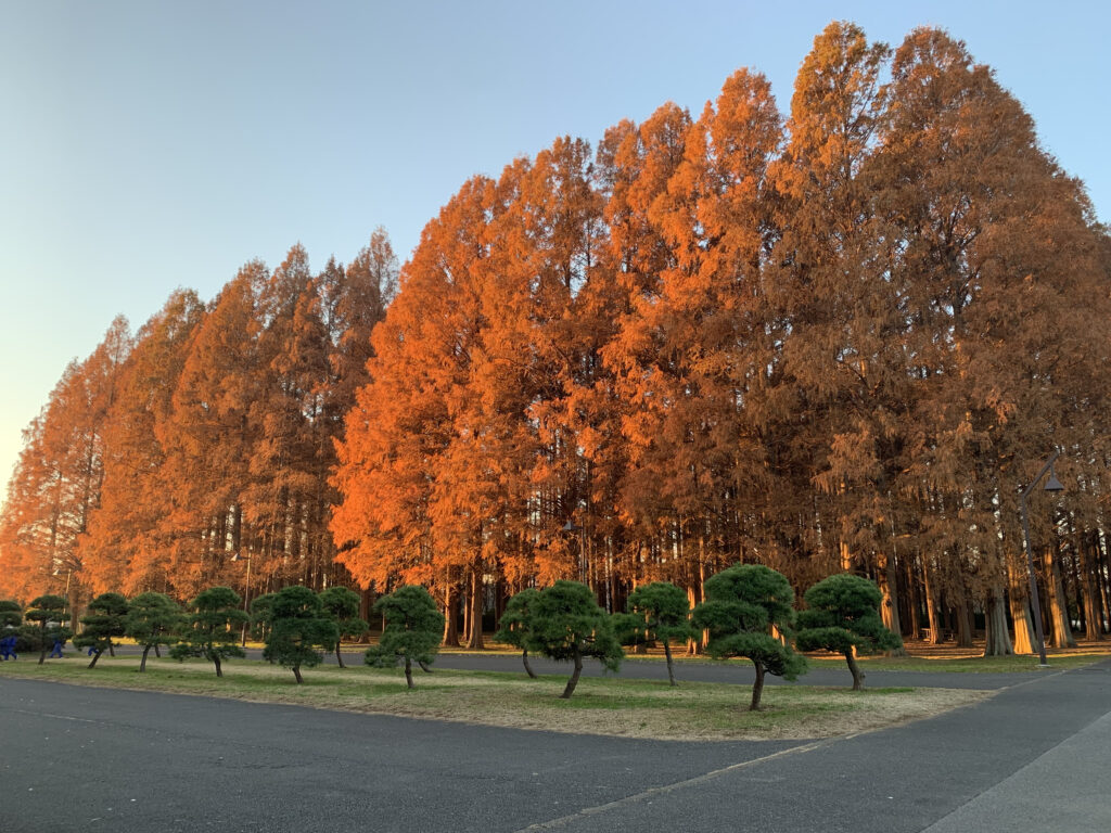 この時期は6時半から7時の間の光の輝きは美しいです。芝生や水辺は朝靄がたちこめ、澄んだ光が、メタセコイヤの間を黄色く突き刺すしますね!